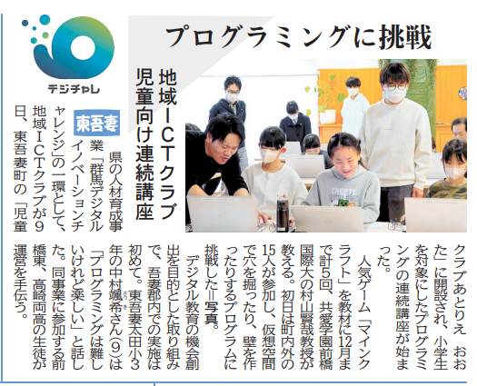 人気ゲーム「マインクラフト」を教材に12月まで計5回、共愛学園前橋国際大の村山賢哉教授に講師を依頼。初日は町内外の15人が参加し、仮想空間で穴を掘ったり、壁を作ったりするプログラムに挑戦しました。