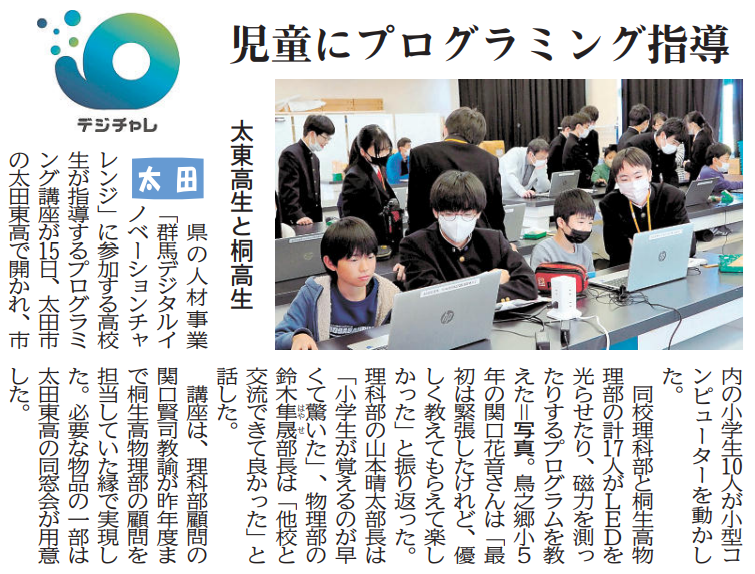 デジチャレに参加する高校生が指導するプログラミング講座が15日、太田市の太田東高で開かれ、市内の小学生10人が小型コンピューターを動かした。