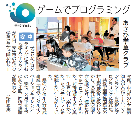 地域ICTクラブが10日、安中市のあさひ学童クラブでスタートしました!市内外の小学生約20人が人気ゲーム「マインクラフト」を教材にプログラミングを体験しました。