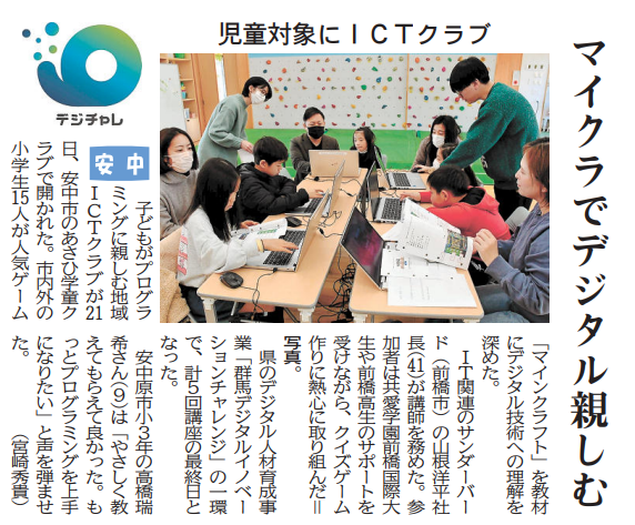 21日に安中市のあさひ学童クラブで最終回の地域ICTクラブを実施。市内外の小学生15人が人気ゲーム「マインクラフト」を教材にデジタル技術への理解を深めました。